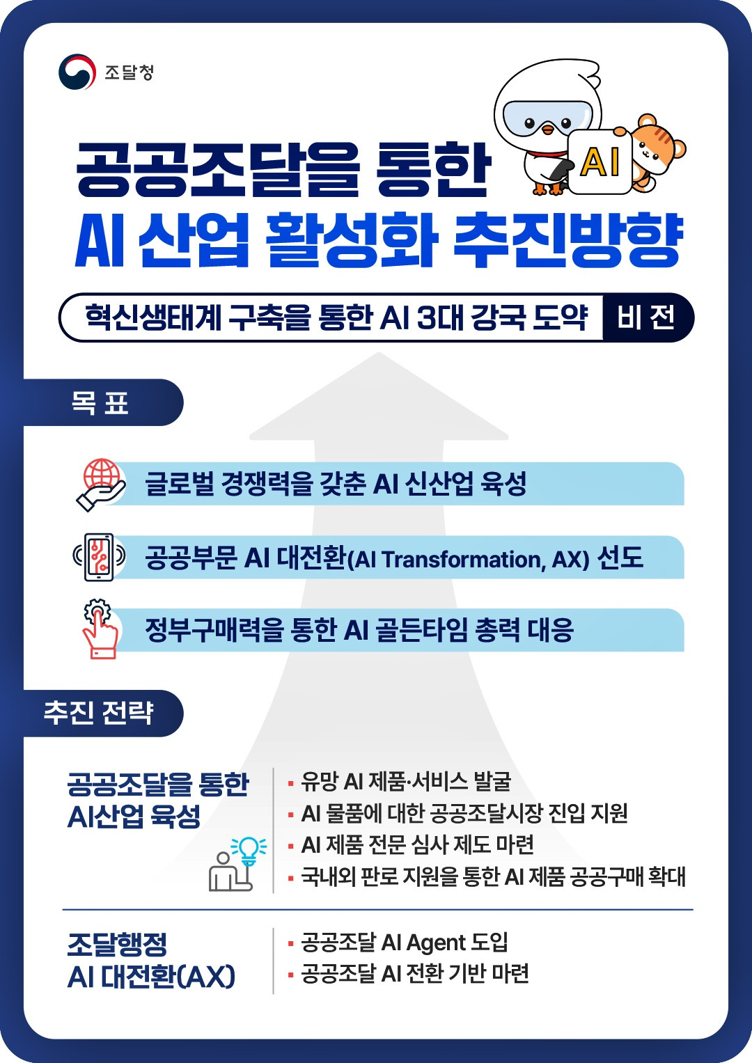 이번 방안은 공공조달을 통한 AI 산업 육성과 조달행정 AI 대전환을 동시에 추진, 공공조달 전 과정을 AI 중심으로 재설계하는 게 목표입니다.
