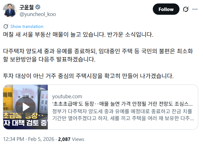 구윤철 부총리 겸 재정경제부 장관은 오늘(5일) 소셜미디어 X(엑스)에 "다주택자 양도세 중과 유예를 종료하되, 임대 중인 주택 등으로 국민이 겪을 수 있는 불편을 최소화할 보완 방안을 다음 주 발표하겠다"고 밝혔습니다.
