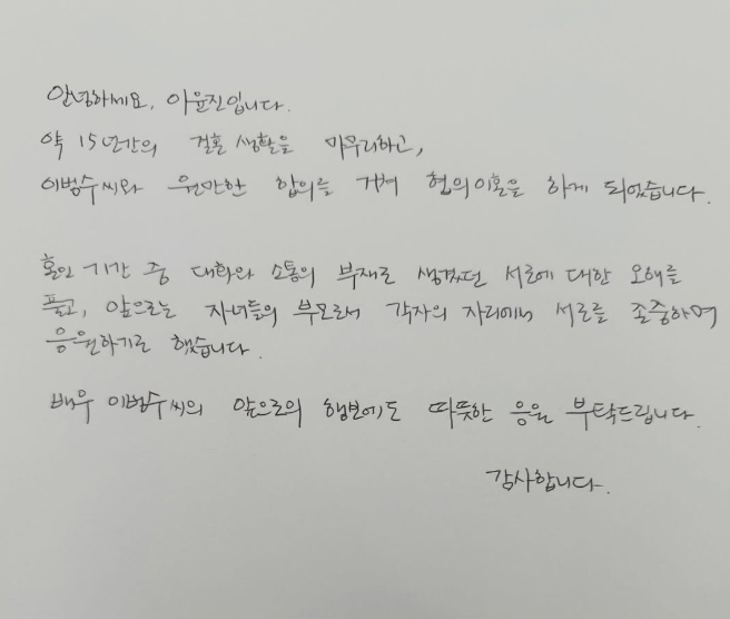 이어 "혼인 기간 중 대화와 소통의 부재로 생겼던 서로에 대한 오해를 풀었다"며 "앞으로는 자녀들의 부모로서 각자의 자리에서 서로를 존중하며 응원하기로 했다"고 덧붙였습니다.