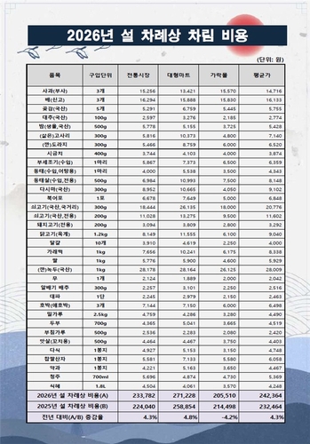 2026년 설 차례상 차림 비용[서울시농수산식품공사 제공][서울시농수산식품공사 제공]이번 조사는 설 명절 연휴 2주 전인 지난달 29일 서울시 물가조사 모니터단과 공사 어르신 일자리 가격조사요원 총 10명이 전통시장 16곳, 대형마트 8곳, 가락몰을 방문해 진행했습니다.