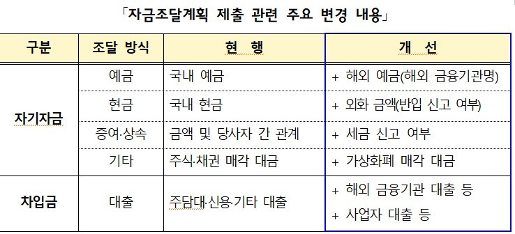 자금조달계획 신고 내용에는 해외 예금, 해외 대출 및 해외금융기관명 등 해외자금 조달 내역이 추가됐고, 기타자금에는 주식·채권 매각대금뿐 아니라 가상화폐 매각대금도 새로 포함됩니다.