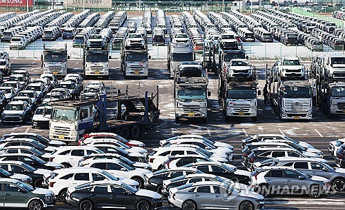 수출 대기 중인 자동차(평택=연합뉴스) 홍기원 기자 = 도널드 트럼프 미국 대통령이 한국 국회가 한미 간의 무역합의 이행에 필요한 법적 절차를 진행하지 않았다고 주장하며 한국산 제품에 대한 관세를 무역합의 이전 수준으로 다시 인상하겠다고 밝혔다.