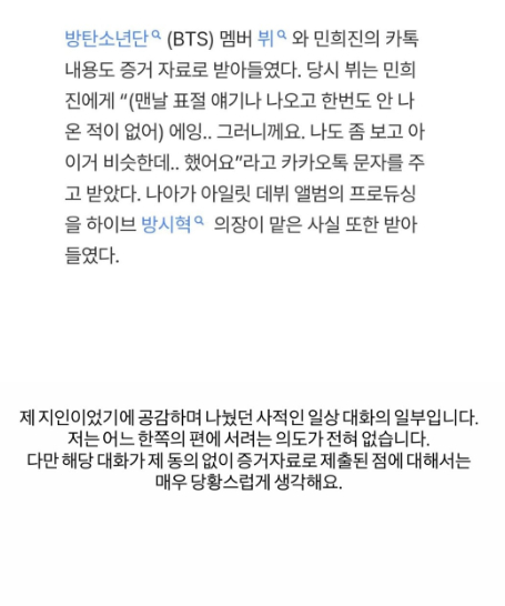 이에 하이브 측은 "상대방의 특정 발언에 동의한 것은 아닌 것으로 확인됐다"며 "아티스트는 사적 대화 내용이 동의 없이 재판 자료로 제출된 것에 대한 불만도 얘기하고 싶었던 것으로 파악됐다"고 설명했습니다.