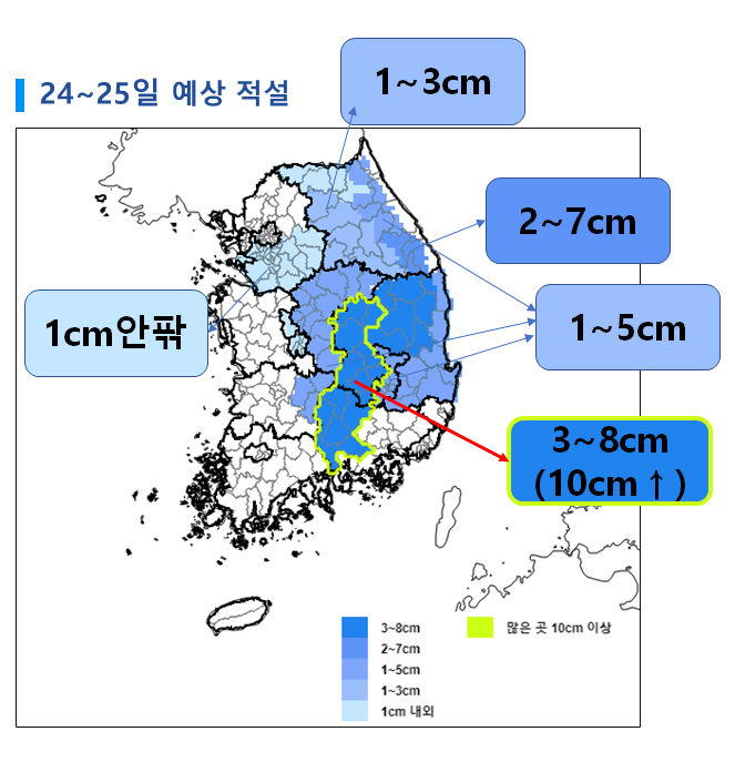 24~25일 예상 적설 [기상청 제공]강원 남부 산지 2~7㎝, 경남과 경북 서부 내륙 3~8㎝ (많은 곳 10㎝ 이상), 충북과 전북 북동부 1~5㎝의 적설이 예상됩니다.
