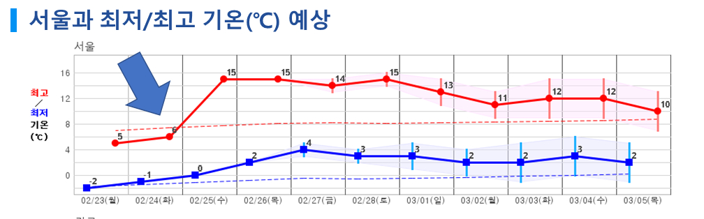 서울 기온 전망 [기상청 제공]북서쪽 찬 고기압의 영향으로 내일(24일) 아침까지도 내륙은 기온이 영하를 보이며 쌀쌀하겠습니다.