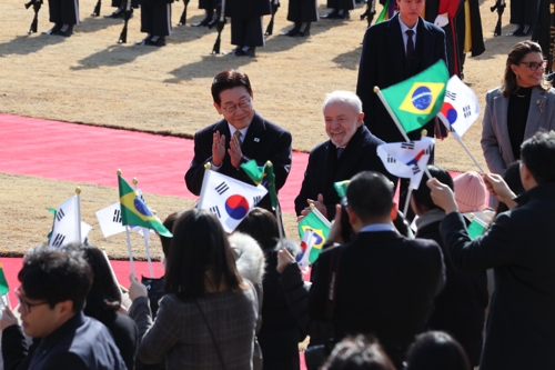 (서울=연합뉴스) 한상균 기자 = 이재명 대통령과 루이스 이나시우 룰라 다시우바 브라질 대통령이 23일 청와대에서 열린 국빈 방한 공식환영식에서 어린이 환영단을 향해 인사하고 있다. 2026.2.23