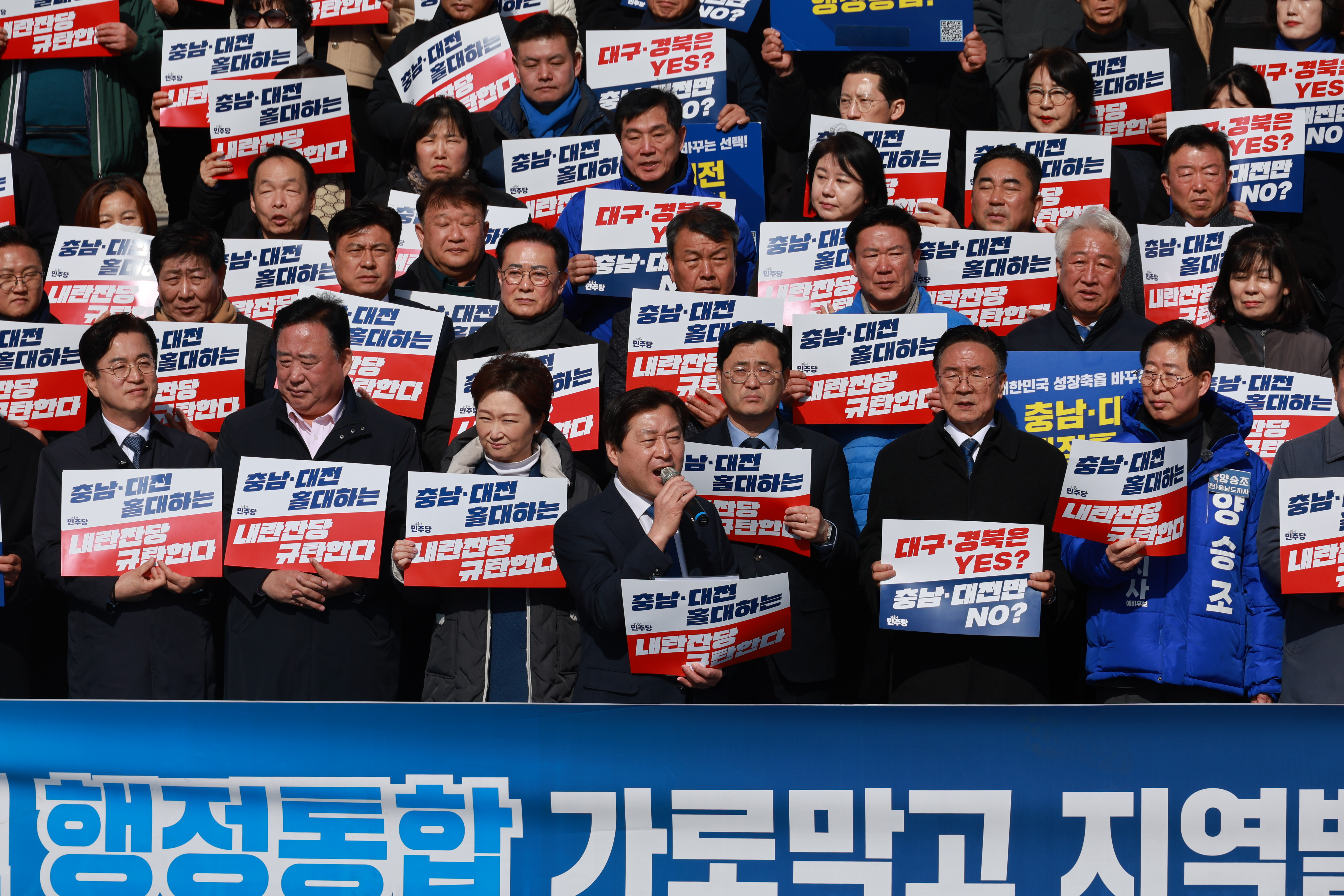 국민의힘 대전·충남 행정통합 반대 규탄하는 더불어민주당[더불어민주당 대전시당 제공. 재판매 및 DB 금지][더불어민주당 대전시당 제공. 재판매 및 DB 금지]