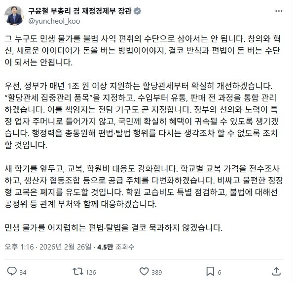 구윤철 부총리 X 캡쳐.구윤철 부총리 X 캡쳐.구윤철 부총리 겸 재정경제부 장관은 "그 누구도 민생 물가를 불법 사익 편취의 수단으로 삼아서는 안 된다"고 밝혔습니다.