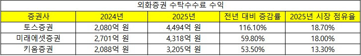 오늘(6일) 금융감독원과 금융투자협회 공시에 따르면, 2025년 결산 기준 토스증권은 외화증권 수탁수수료(브로커리지) 수익 4,494억 원을 기록하며 업계 1위에 올라섰습니다.