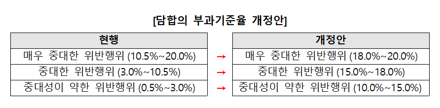 '중대한 담합'은 3.0∼10.5%에서 15.0∼18.0%로 강화되고, '매우 중대한 담합'은 하한이 10.5%에서 18.0%로 대폭 높아집니다.