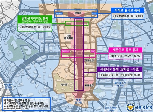 세종대로 광화문∼시청 구간은 공연 전날인 20일 오후 9시부터 공연 다음 날인 22일 오전 6시까지 33시간 동안 교통이 통제됩니다.