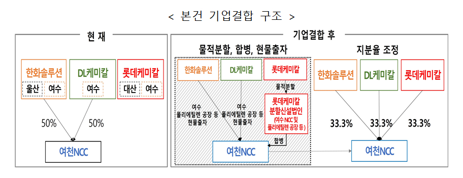 기업결합이 완료되면 최종적으로 롯데케미칼·한화솔루션·DL케미칼이 여천NCC의 지분을 3분의 1씩 보유해 3개사가 공동으로 지배할 예정입니다.
