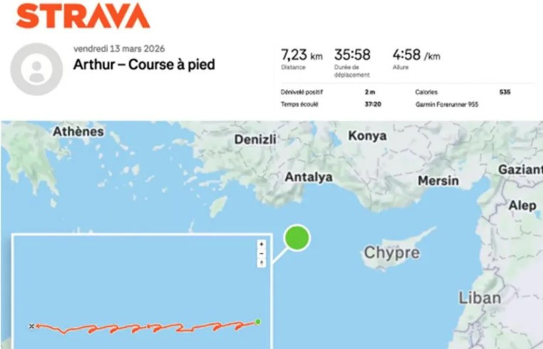 해당 군인는 동지중해로 이동 중이던 항공모함 갑판 위에서 약 35분간 달리기를 했으며, 이 기록이 스마트워치를 통해 측정된 뒤 피트니스 앱에 업로드된 것입니다.