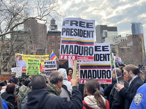 26일(현지시간) 미국 뉴욕 남부연방법원에서 열린 니콜라스 마두로 베네수엘라 대통령 석방 촉구 시위[연합뉴스 제공][연합뉴스 제공]연합뉴스TV 기사문의 및 제보 : 카톡/라인 jebo23
