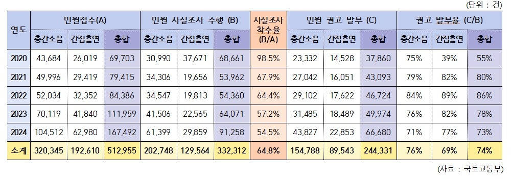 2020~2024년 공동주택 층간소음·간접흡연 민원 사실조사 수행 및 권고 발부 현황[출처=민홍철 의원실][출처=민홍철 의원실]실제로 층간 흡연 문제는 갈수록 심각해지고 있습니다.