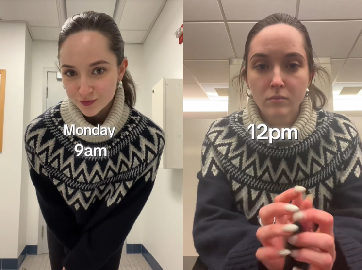 영상 속에서 그는 아침 9시에는 단정한 머리와 깨끗한 피부톤을 자랑하고 있지만, 점심 때가 되자 머리는 엉겨 붙고, 눈은 퀭한 데다 얼굴은 부은 모습이 됐습니다.