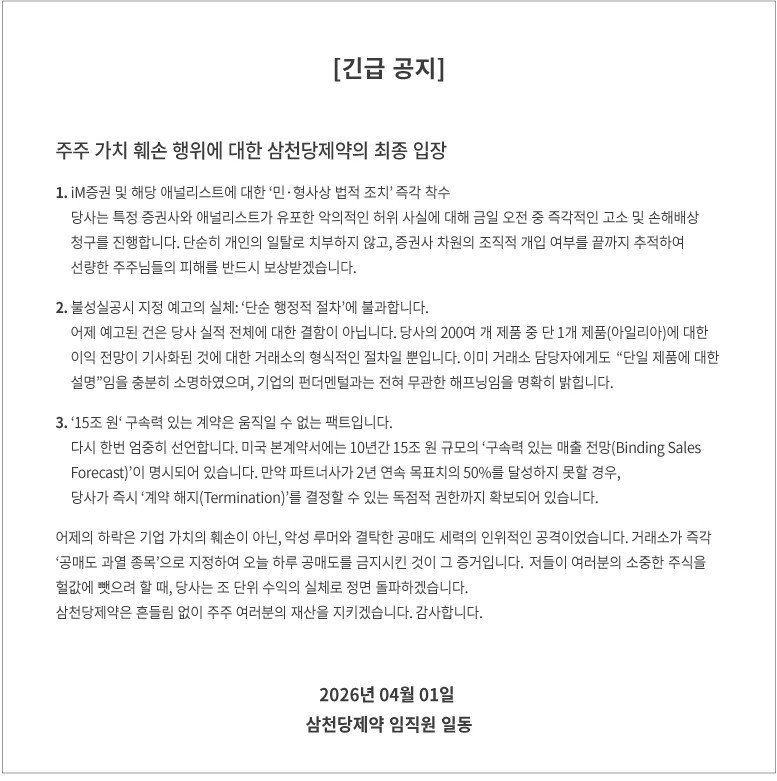 삼천당제약은 블로거 A씨를 고발할 뿐만 아니라 iM증권과 해당 애널리스트에 대해서도 고소 및 손해배상 청구를 진행한다고 공지했습니다.