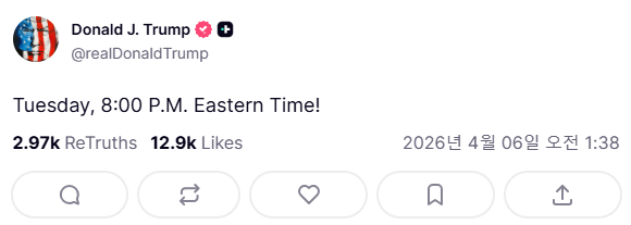 별다른 설명 없이 "미 동부시간 기준 7일 오후 8시!"라는 문구만 올라왔는데, 당초 정해둔 공격 유예 시한을 약 하루 연장한 것으로 해석됩니다.