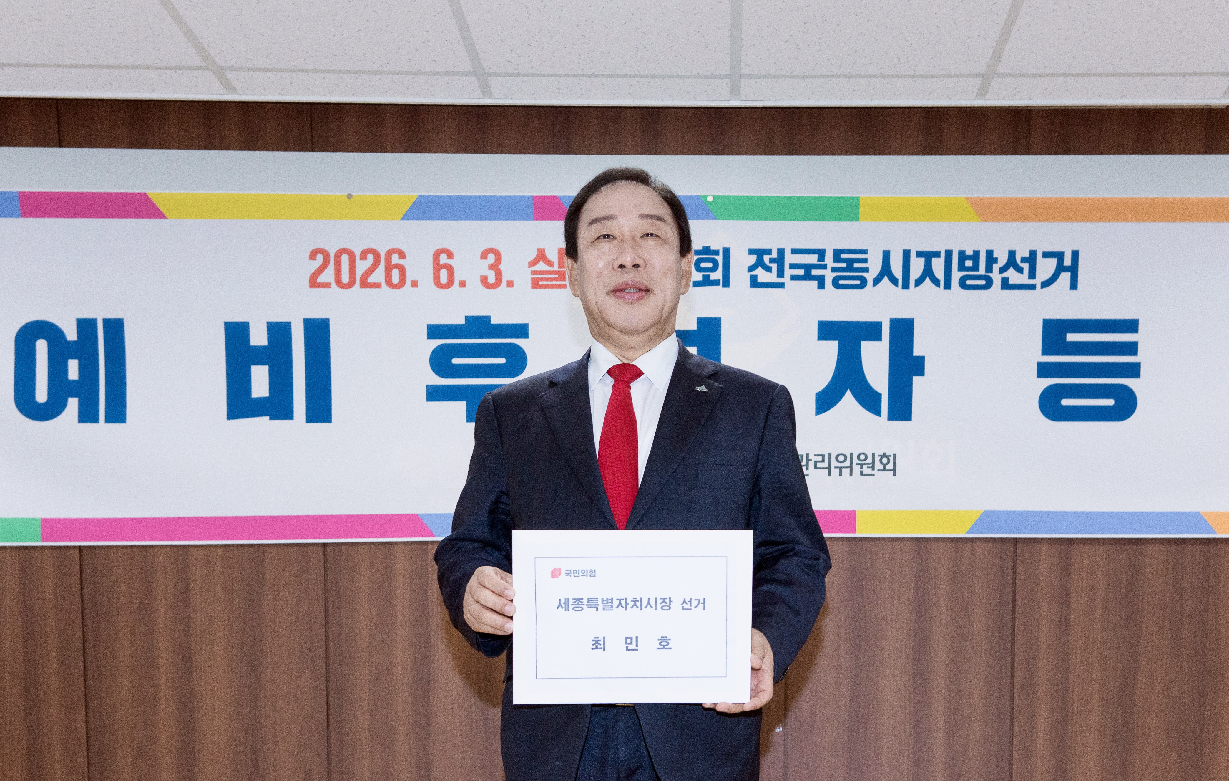 세종시장 예비후보 등록하는 최민호 세종시장[최민호 예비후보 측 제공. 재판매 및 DB 금지][최민호 예비후보 측 제공. 재판매 및 DB 금지]지난달 11일 국민의힘 세종시장 후보로 단수 공천된 그는 이날 출마 선언 직전 세종시선거관리위원회를 찾아 예비후보 등록을 마쳤습니다.