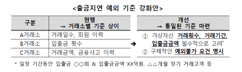 금융위는 오늘(8일) 가상자산 거래소별로 달랐던 출금 지연 예외 기준을 정비해, 통일된 표준 내규를 마련했다고 밝혔습니다.
