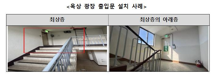 조사 대상의 40%(8곳)는 옥상광장이 최상층이 아닌 바로 아래층에 위치해 있었고, 이 가운데 5곳은 최상층으로 향하는 계단이 별다른 차단 없이 개방돼 있어 잘못 대피할 우려가 있는 것으로 나타났습니다.