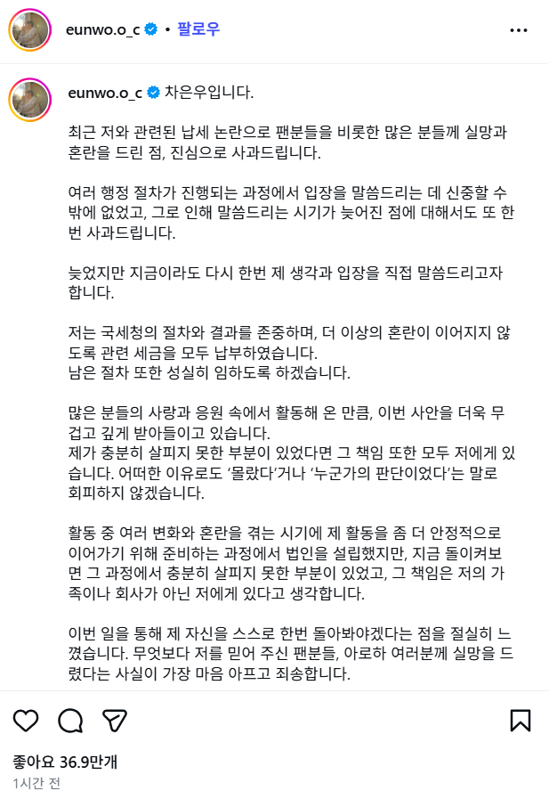 차은우 SNS 게시글군 복무 중인 가수 겸 배우 차은우가 수백억 원대 탈세 의혹에 대해 재차 사과했습니다.
