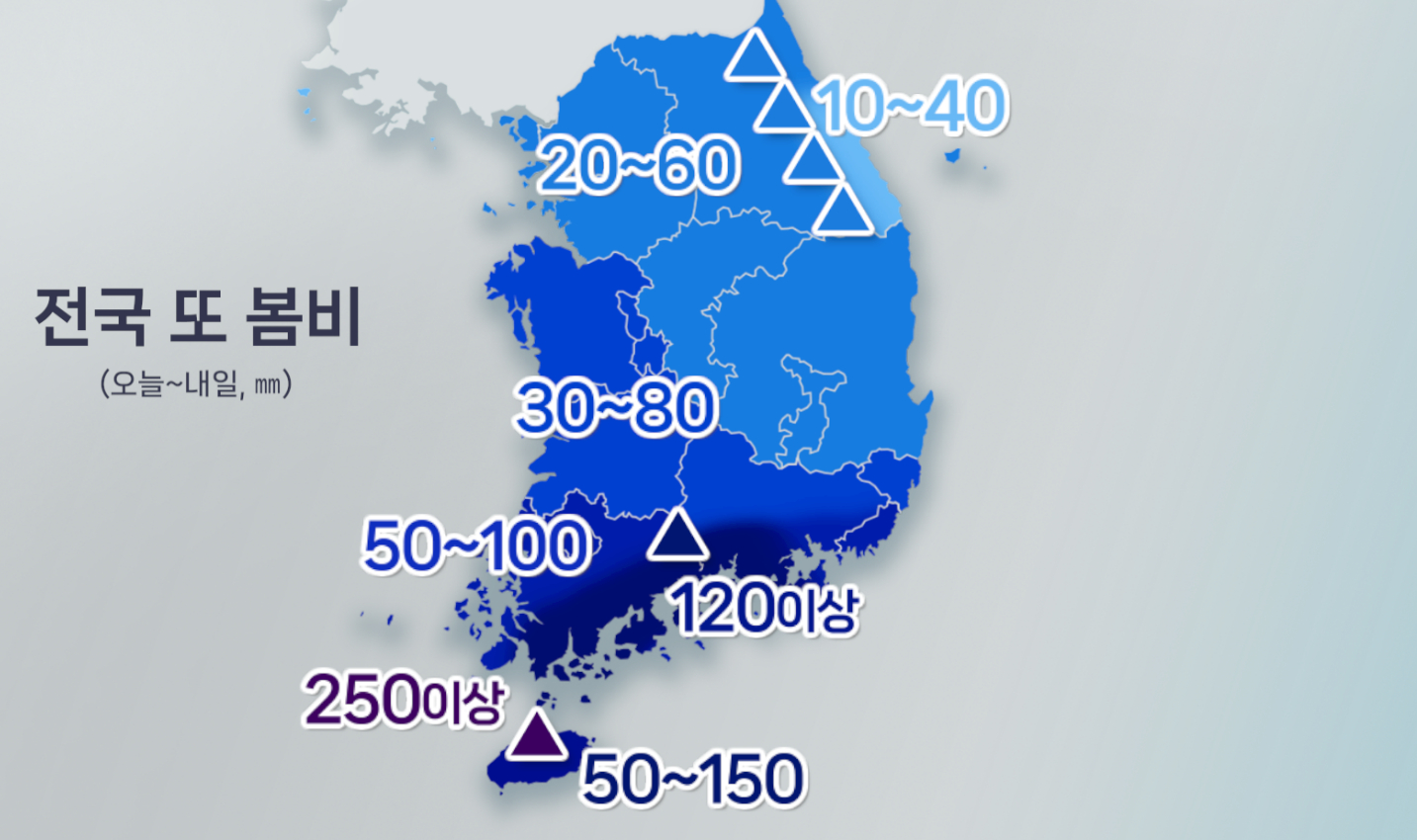 벚꽃과 봄비[연합뉴스 제공][연합뉴스 제공]오늘(9일)과 내일(10일) 전국 대부분에서 비가 내리겠고, 전남해안과 경남남해안, 지리산 부근, 제주도를 중심으로는 매우 강하고 많은 비가 예상됩니다.