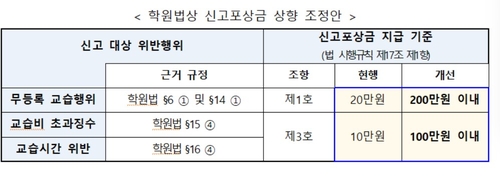 학원법상 신고포상금 상향 조정안[교육부 제공][교육부 제공]교육부는 이번 단속 결과를 바탕으로 학원비 불법 인상을 막기 위한 제도 개선에 나서기로 했습니다.