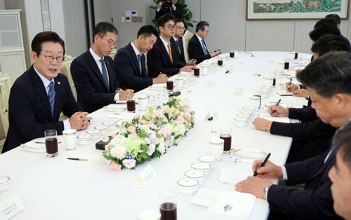 (서울=연합뉴스) 한상균 기자 = 이재명 대통령이 18일 용산 대통령실에서 증권사 리서치센터장들과 오찬 간담회를 하고 있다. 2025.9.18