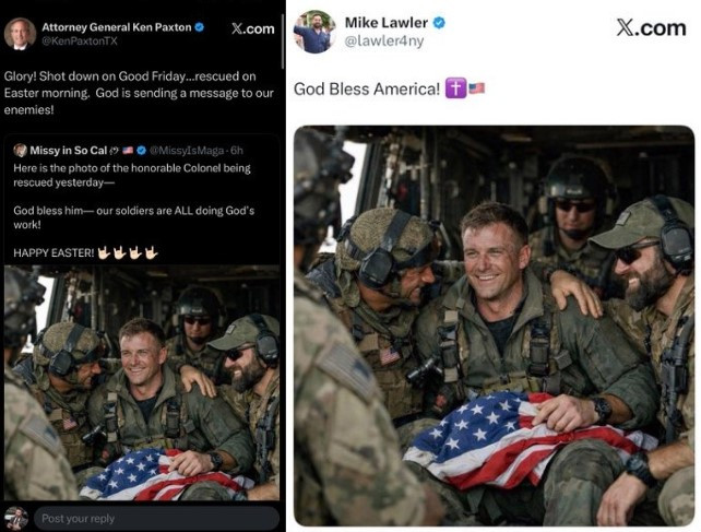 텍사스 법무장관 켄 팩스턴과 공화당 하원의원 마이크 롤러 등도 "신이 우리의 적에게 메시지를 보낸 것", "신이 미국을 축복한다"는 등의 글과 함께 해당 이미지를 잇따라 공유했습니다.