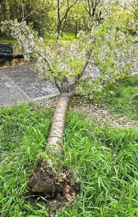 쓰러진 벚나무[출처=시나닷컴][출처=시나닷컴]공원 직원들이 즉시 현장에 출동해 쓰러진 나무를 지지대로 고정하고 긴급 가지치기를 진행해 나무를 살린 것으로 전해졌습니다.