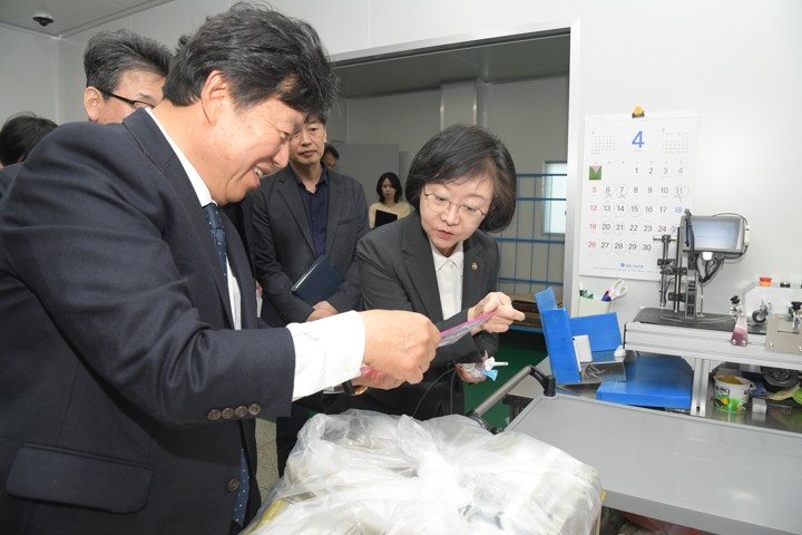 (서울=연합뉴스) 오유경 식품의약품안전처장이 8일 경기도 안산시 소재 수액세트 제조업체 메디라인액티브코리아를 방문, 제품을 살펴보고 있다. 2026.4.8 [식품의약품안전처 제공. 재판매 및 DB 금지]