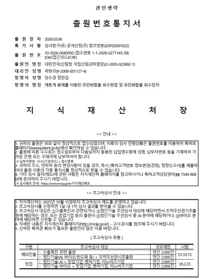 출허출원통지서[국립산림과학원 제공. 재판매 및 DB 금지][국립산림과학원 제공. 재판매 및 DB 금지]장수경 임산소재연구과 연구사는 "이번 기술 개발로 친환경 원료 5-HMF의 생산 과정의 핵심인 추출 공정의 효율을 높일 수 있게 됐다"며 "산림 바이오매스의 고부가가치 활용을 위한 원천기술 경쟁력 확보에 최선을 다하겠다"고 말했습니다.