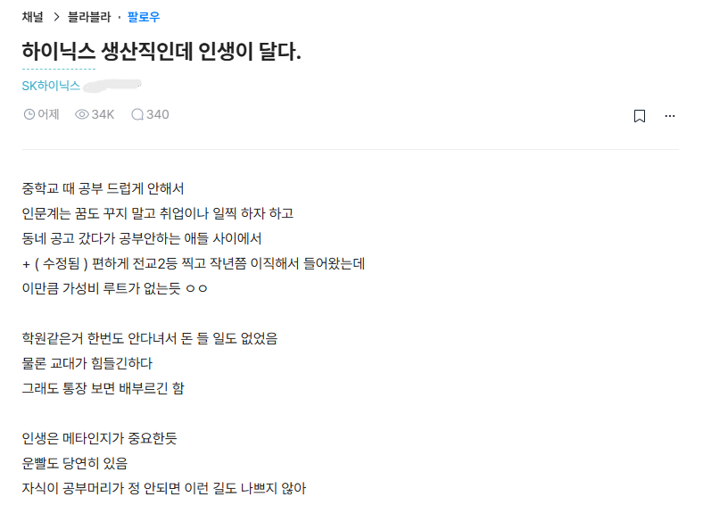 지난 14일 직장인 익명 커뮤니티 블라인드에 "하이닉스 생산직인데 인생이 달다"라는 제목의 글이 게시돼 화제가 됐습니다.
