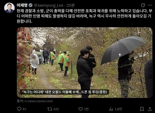 이 대통령 "늑구 안전포획 노력 중…인명피해 발생하지 않길"이재명 대통령은 대전 오월드에서 탈출한 늑대 '늑구'와 관련해, "부디 어떠한 인명 피해도 발생하지 않기를 바란다"고 밝혔습니다.이 대통령은 오늘(9일) 자신의 SNS에 늑구의 수색 상황을 담은 기사를 공유하며 이같이 적었습니다.