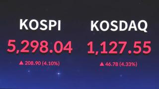 코스피, 4%대 상승…5,300선 턱밑까지 복귀[앵커]코스피가 미국 기술주 훈풍에 오늘(9일) 4%대 상승 마감해 5,300선에 다시 바짝 다가섰습니다.코스닥도 1,100선을 회복하며 상승 마감했습니다.자세한 마감 시황, 취재기자 연결해 들어봅니다.김채영 기자.[기자]네, 오