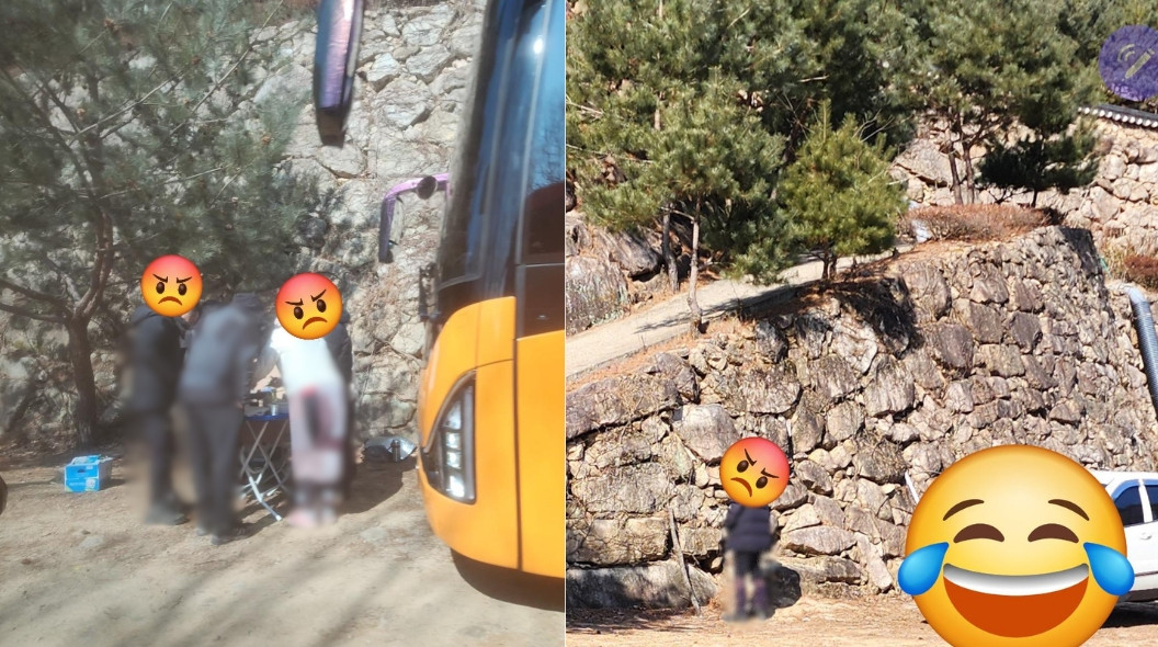 사찰 앞에서 고기 굽고 노상 방뇨…"산행 온 사람들 맞나" 공분사찰 주차장에서 고기를 굽고 노상 방뇨를 하는 산악회원들의 모습이 포착돼 비난이 일고 있습니다.8일 한 온라인 커뮤니티에는 "산악회 분들 너무한 거 아니냐"는 제목으로 두 장의 사진이 올라왔습니다.사진에는 대형 버스 앞에서 테이블