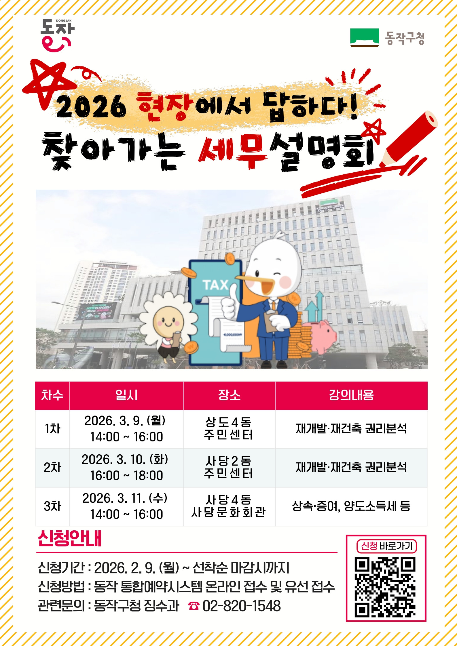 동작구 '찾아가는 세무설명회'…"재개발·재건축 궁금증 해소"서울 동작구가 재개발과 재건축이 활발하게 진행되는 구 특성을 반영해 '찾아가는 세무설명회'를 다음 달 개최한다고 밝혔습니다.다음 달 9일부터 11일까지 사흘에 걸쳐 진행되는 설명회는 신속통합기획과 재개발·재건축 권리분석, 상속세와