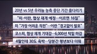 [이시각헤드라인] 4월 14일 뉴스투나잇■20년 vs 5년 우라늄 농축 중단 기간 줄다리기■미국이 20년 동안 우라늄 농축을 멈추면 경제 제재를 대폭 풀어주겠다고 제안한 것으로 알려졌습니다.이란은 농축 중단은 길어야 5년까지만 가능하다고 맞선 것으로 전해집니다.■"미·
