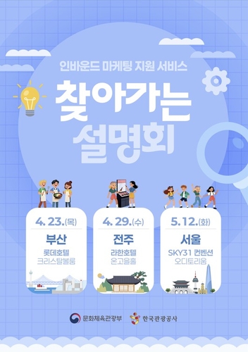 관광공사, 인바운드 마케팅 설명회…외래객 유치 지원 강화한국관광공사와 문화체육관광부가 외래 관광객 유치를 위한 업계 지원에 나섭니다.관광공사는 인바운드 마케팅 지원 서비스를 소개하는 ‘찾아가는 설명회’를 개최한다고 밝혔습니다.설명회에서는 관광·마케팅 특화 강연과 함께 관광 전문가 1대