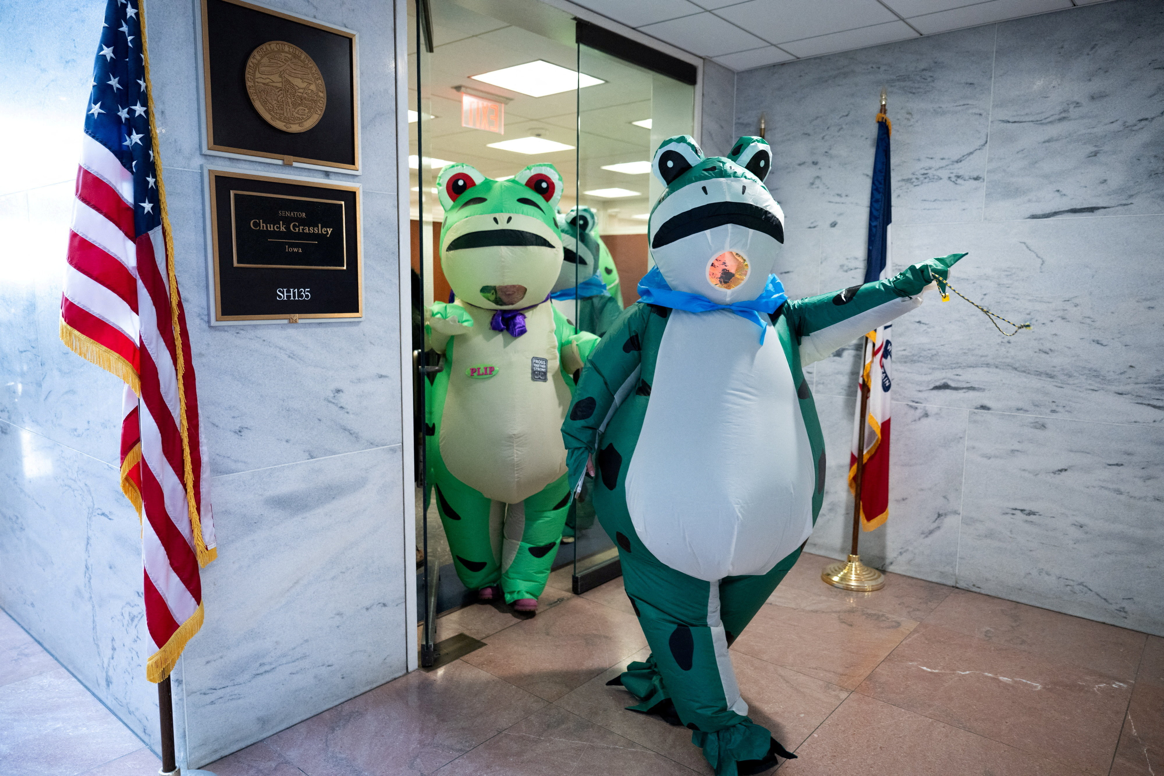 반(反)트럼프 개구리 부대, 국정연설에 '부패의 실태' 맞불 행사도널드 트럼프 미국 대통령이 2기 첫 국정연설(State of the Union)을 한 가운데, 개구리 복장을 한 반(反)트럼프 부대가 '맞불 집회'에 참석했습니다.로이터에 따르면 현지시간 24일, 미국 민주당은 워싱턴 D.C.에