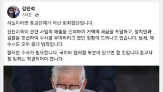 김민석 국무총리가 신천지 로비 의혹과 관련해 "사실이라면 종교단체가 아닌 범죄집단"이라고 비판했습니다.김 총리는 어제(5일) SNS에 관련 보도를 공유하면서 "신천지 측이 사업 매출을 은폐해 거액의 세금을 포탈하고 정치권·검찰을