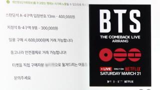 단속 피하려 '아이디 양도'…BTS 공연 암표 '꼼수' 기승[앵커]방탄소년단의 컴백 공연이 다가오면서 광화문 광장 메인 무대도 모습을 갖춰가고 있습니다.기대감이 커지는 가운데, 티켓을 구하지 못한 팬들을 노린 암표 거래도 기승을 부리고 있습니다.이따끔 기자가 보도합니다.[기자]방탄소년단