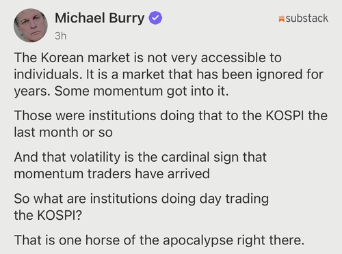 '빅쇼트' 주인공 버리, 코스피 급등락에 "종말 징후"영화 '빅 쇼트'의 실제 인물로 유명한 미국의 공매도 투자자 마이클 버리가 코스피 급등락 사태를 두고 불길한 사태의 전조를 시사한다고 평가했습니다.버리는 현지시간 5일 온라인 뉴스레터 플랫폼 서브스택에 올린 글에서 "한국 증시는