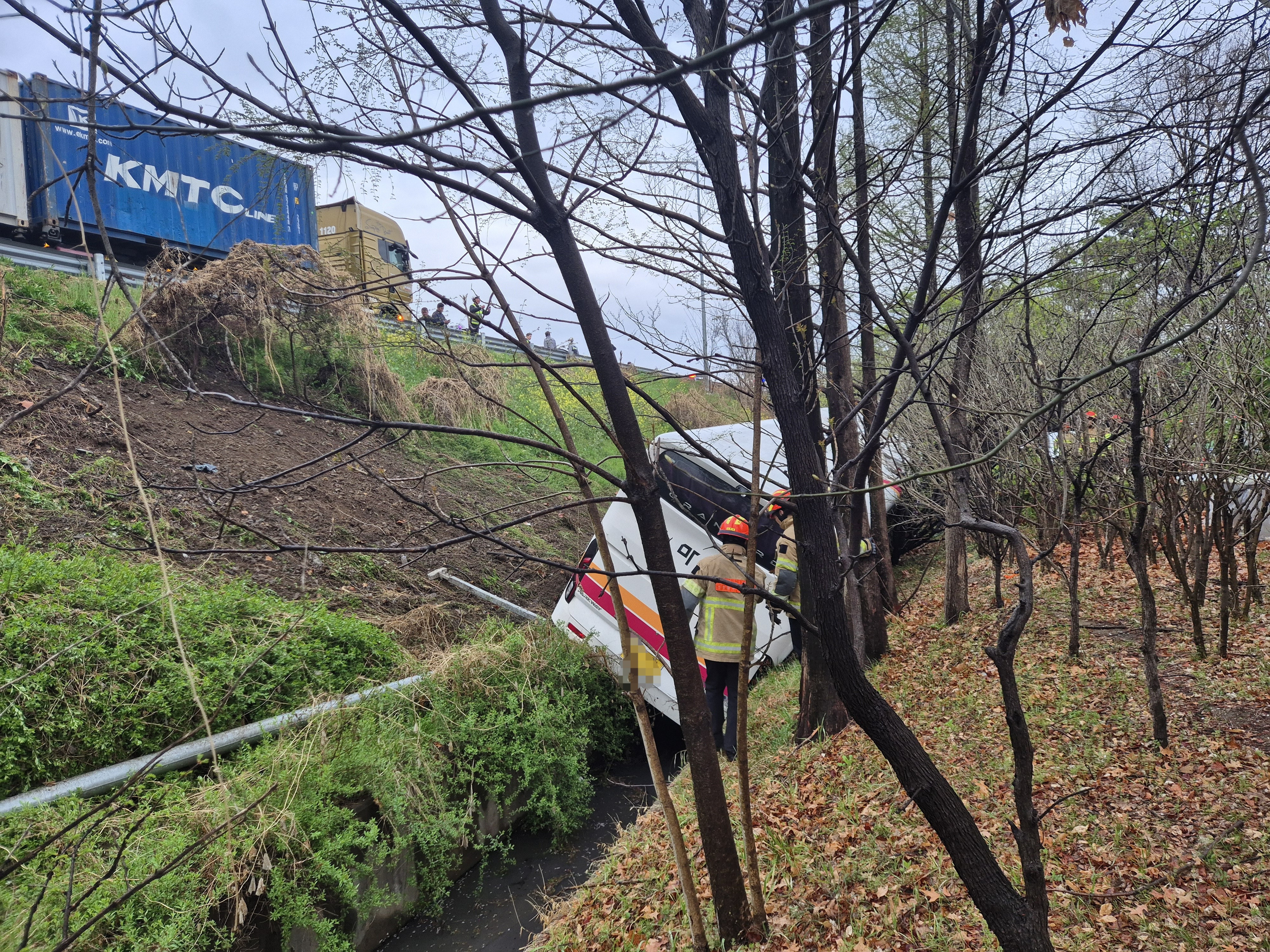 대구서 빗길 사고 고속버스 경사면 아래로 미끄러져…8명 경상오늘(6일) 오후 4시 10분쯤 대구 북구 팔달동 경부고속도로 부산 방향 금호분기점 인근에서 버스가 가드레일을 뚫고 약 5m 아래 경사면으로 미끄러지는 사고가 났습니다.이 사고로 버스 운전자와 승객 등 8명이 다쳐 이 가운데 6명