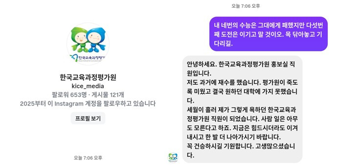 “사람 일은 아무도 모릅니다”…5수생 메시지에 평가원이 보낸 위로한 4수생이 한국교육과정평가원 공식 인스타그램 계정과 나눈 짧은 메시지가 온라인을 뜨겁게 달구며 수험생들에게 큰 울림을 전하고 있습니다.5일 SNS 플랫폼에 한 수험생 A씨가 “감동”이라는 글과 함께 메시지 캡처 이미지를 올렸습니