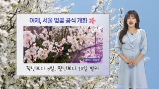 [날씨] 오늘 전국 건조함 달래줄 단비…제주·남해안 호우어제 서울에서 벚꽃이 공식적으로 개화를 시작했습니다.여의도 윤중로에서도 꽃망울을 터뜨린 벚꽃을 볼 수 있었는데요.이번 개화는 따뜻한 날씨로 인해 작년보다는 엿새, 평년보다 열흘이나 빨랐습니다.오늘은 그간의 건조함을 달래줄 단비가