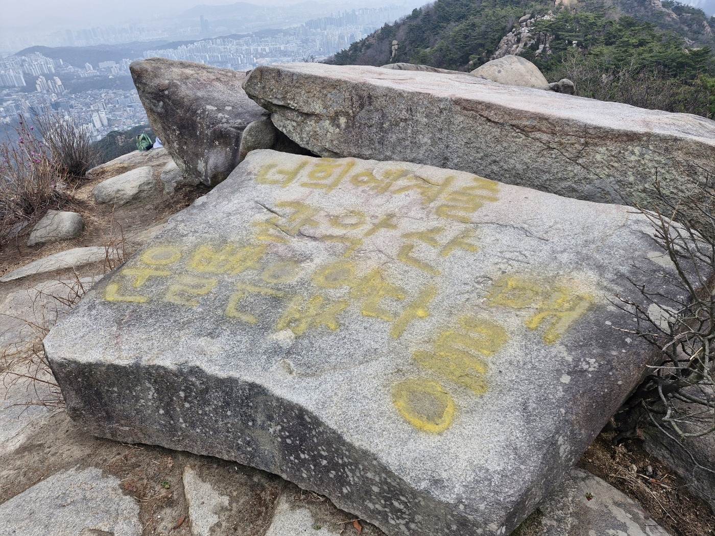 "너희에게 줄 운빨 없다, 메롱"…관악산 마당바위 낙서 경찰 수사 의뢰서울 관악구가 관악산 마당바위에 남겨진 래커칠 낙서에 대해 경찰 수사를 의뢰했습니다.관악구청은 지난달 30일 관악산 마당바위에 낙서가 칠해진 사실을 인지하고, 이에 대해 경찰에 수사를 의뢰했다고 오늘(1일) 밝혔습니다.관악산 명소