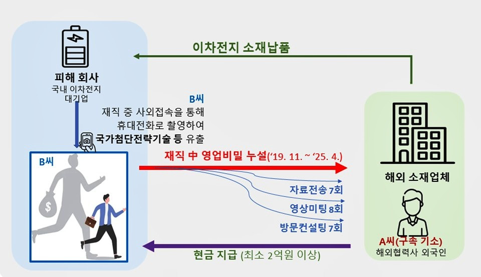 대기업 이차전지 핵심기술 유출 외국인 구속기소기업 임직원과 내통해 자료 빼돌려…지재처 "검찰과 공조해 기술유출 막아"지식재산처 기술디자인특별사법경찰(기술경찰)과 대전지검 특허범죄조사부는 국가첨단전략기술이 포함된 기업 자료를 빼돌린 해외협력사 영업총괄 외국인 A씨(34)를 국