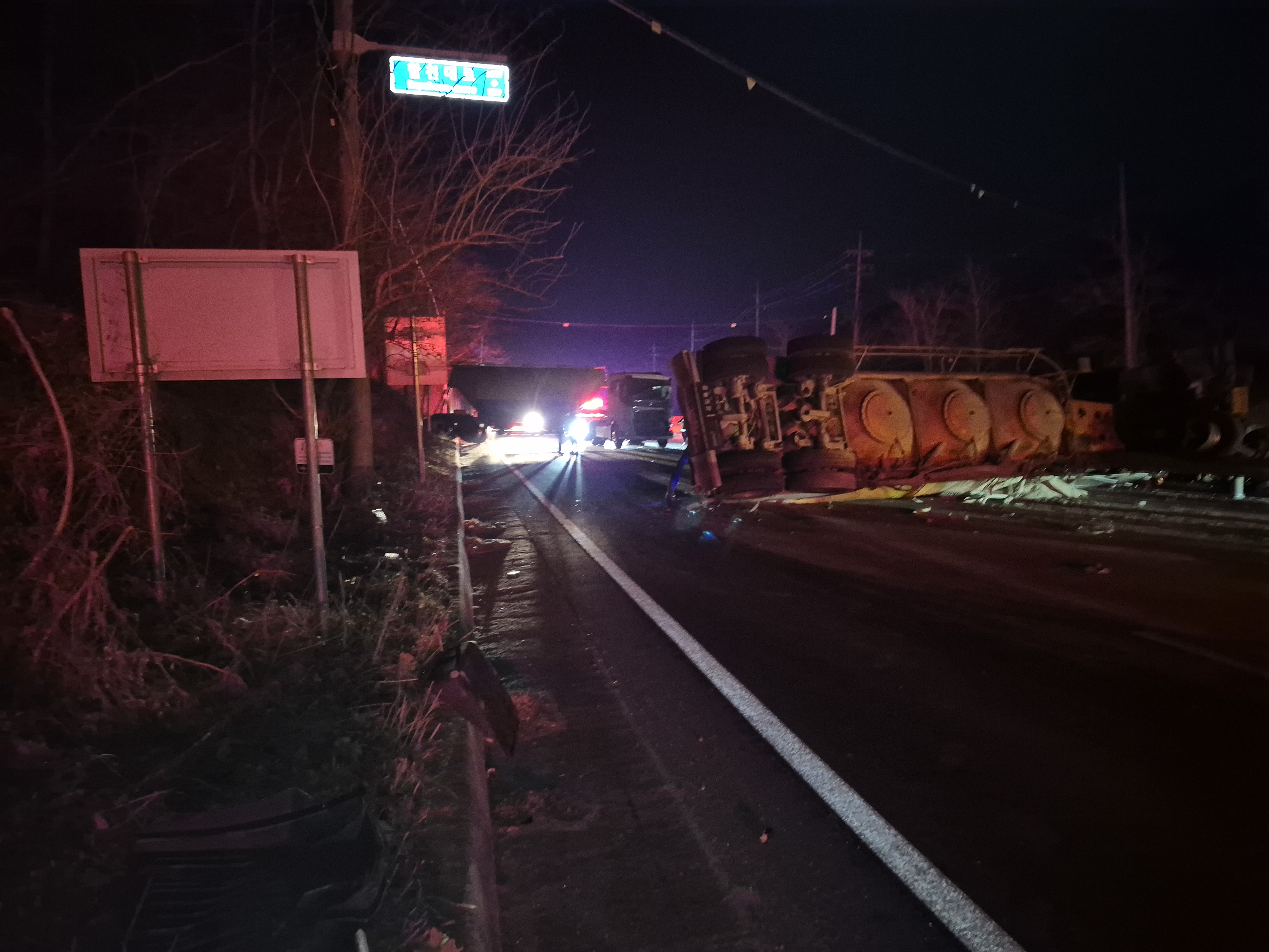 오늘(13일) 오전 5시 10분쯤 경남 합천군 대양면에서 시멘트 트레일러 화물차가 중앙분리대를 들이받고 옆으로 넘어졌습니다.이어 맞은 편에서 달리던 화물차가 전도된 트레일러와 충돌했고, 사고 현장을 피하려던 다른 화물차 2대가 서